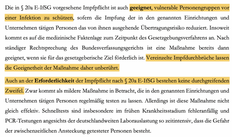 „Trotz dieser hohen Anforderungen, die aus der Eingriffsintensität im Hinblick auf Art. 2 Abs. 2 S. 1 GG und Art. 12 GG ergeben, ist die Impfpflicht in § 20a E-IfSG angemessen. Die Regelung schützt das Leben und die körperliche Unversehrtheit besonders vulnerabler Personen nach Art. 2 Abs. 2 S. 1 GG.“