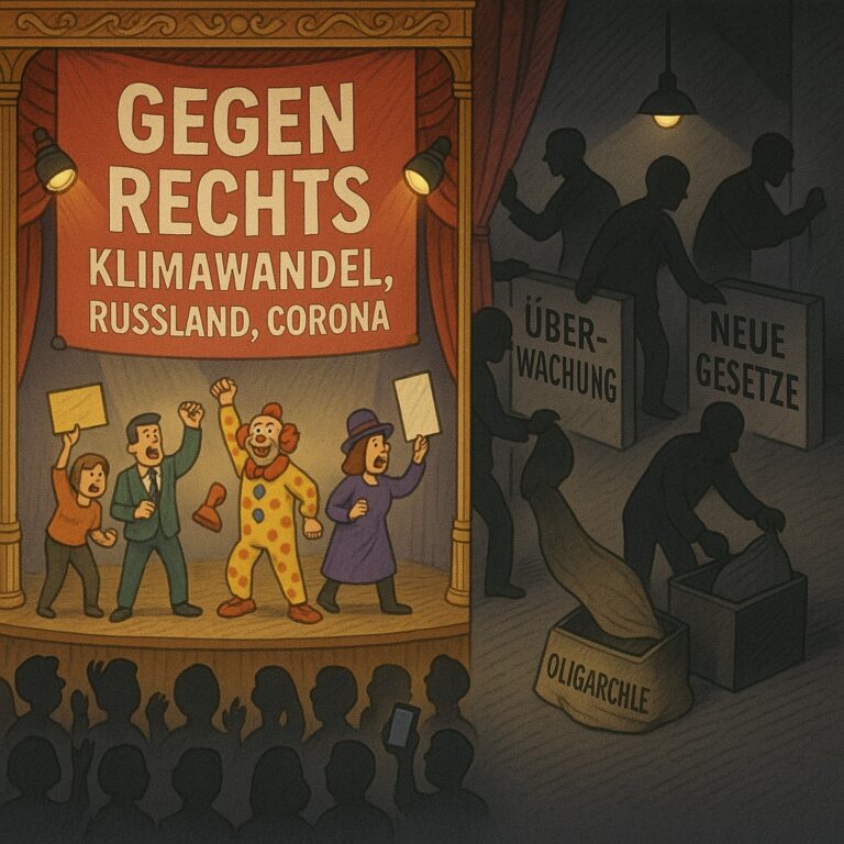 Als die Rechten erstarkt waren, begann der zweite politische Schritt: Die mediale und gesellschaftliche Kampagne „Alles gegen rechts“. Diese Erzählung scheint auf den ersten Blick wie eine moralische Abwehr, ist aber im Kern ein Ablenkungsmanöver. Während der Fokus auf der Abwehr von rechts liegt, geraten die wahren Ursachen – soziale Ungleichheit, Oligarchisierung, die Aushöhlung der Demokratie, fehlende soziale Gerechtigkeit und ökologische Systemfragen – aus dem Blick.