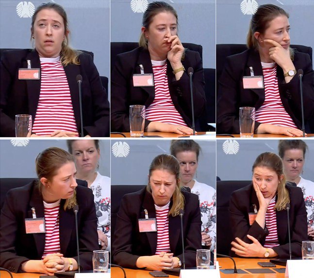 Zurück zu Klafki. Auf Facebook entdeckte ich einen Post von Monica Neve, der es mir wert schien, auch auf anderen sozialen Medien verbreitet zu werden. Man möge sich den Gesichtsausdruck von Anika Klafki bei den Ausführungen von Prof. Schachtschneider einmal ansehen. Er spricht Bände. So etwas gehört sich schlichtweg nicht. Es zeigt aber auch, wie es sie vor Schmerzen fast zu zerreißen scheint. Vermutlich kann man hier kognitive Dissonanz bei der Arbeit beobachten: