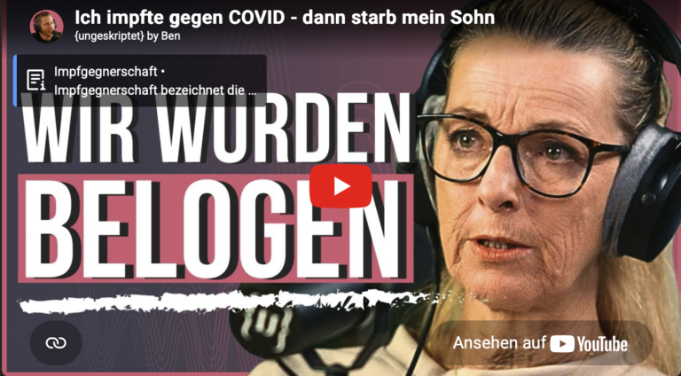 Sabine hat im Impfzentrum gearbeitet. Man konnte dort sehr gut verdienen. Auch ihren Sohn hat sie dorthin bewegt. Sie berichtet darüber, wie und was da abgelaufen war. Das Erschütterndste für mich: Sie selbst ging so weit, ein Kind zu spritzen – durch den Pullover auf Anweisung eines sehr renommierten Kinderarztes. Sie selbst und ihr Sohn haben sich ebenfalls „impfen“ lassen (der korrekte Terminus ist Transfektion, nicht Impfung). Bei ihrem Sohn stellten sich in der Folge verheerende Schäden ein, die schließlich dazu führten, dass er sich das Leben nahm.