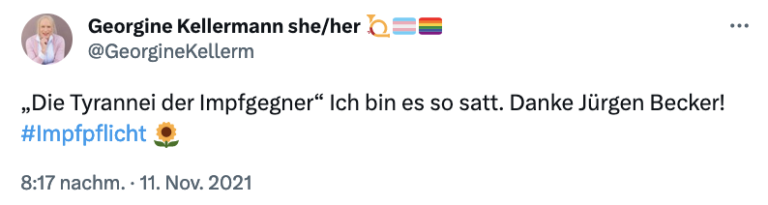Es passt jedoch alles zusammen und ins Bild. Georgine Kellermann hetzte auch gegen Ungeimpfte und beteiligte sich emsig an der Zerstörung von Demokratie und Gesellschaft. Es kommt eben nicht nur auf’s Äußere an. Ein genauer Blick hinter die Fassade verschafft oftmals mehr Klarheit.