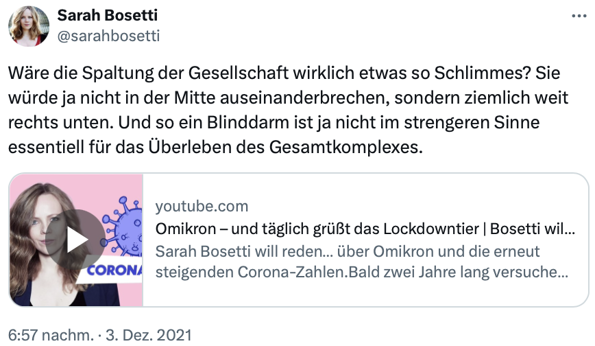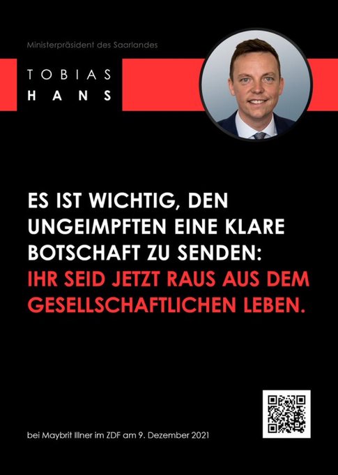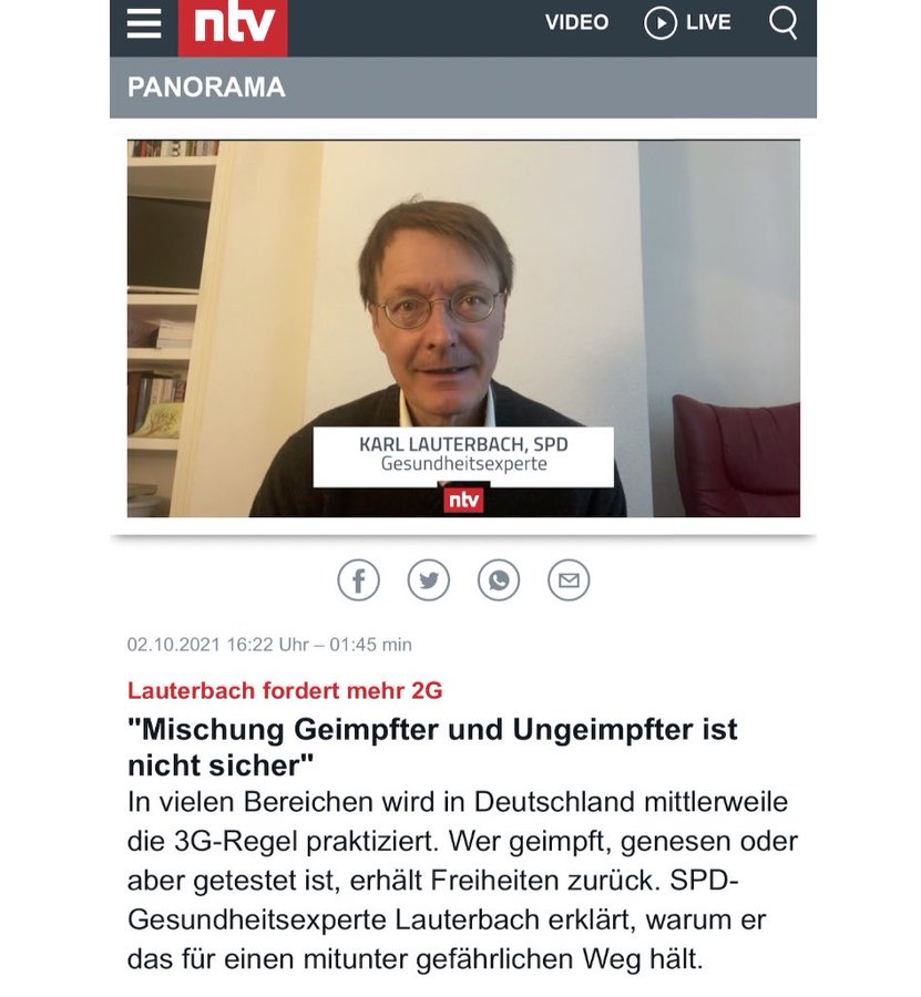 Das war der Zeitgeist. Die Menschen in Angst und Schrecken versetzen, obwohl man es besser weiß und dann diese Angst ausnutzen, um die Grundrechte mit Zustimmung einer willfährigen Mehrrheit immer weiter einzuschränken. Im Oktober 2021 ging es strikt in die faschistoide 2G-Phase und die Lüge der Pandemie der Ungeimpften stand unmittelbar bevor und ermöglichte die Einführung der sektoralen Impfpflicht. Karl Lautberbach spielte wie so oft den Scharfmacher mit der Forderung nach mehr 2G, obwohl man wusste, dass die genetischen Impfstoffe weder eine Ansteckung noch eine Weitergabe des Virus verhinderten. Das 2G-Regime war völlig grundlos. Die Impfpflicht erst recht. Diese größte systematische Diskriminierung seit damals ist den Meisten bis heute egal – vor allem den doppelmoralinsauren Brandmaurern, die diese Wissenschafts- und Demokratiefeindlichkeit bis heute verteidigen.