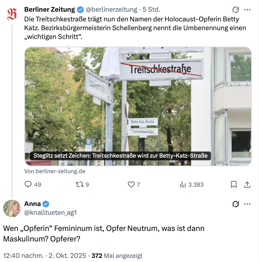 Und was muss ich in dem Artikel lesen?!? „Bezirksbürgermeisterin Maren Schellenberg betonte: „Es ist ein wichtiger und richtiger Schritt, Antisemiten aus dem Stadtbild zu entfernen…“ Ich dachte erst, die hat zu viel Martin Sellner von der Identitären Bewegung gehört und wäre jetzt remigrationsunkritisch. Aber puh! Glücklicherweise handelt es sich bei der Politikerin nur um die Grünen immanente Doppelmoral, Heuchelei oder Symbolpolitik. Man importiert natürlich weiterhin hunderttausendfach Antisemitismus und bekämpft ihn durch eine aufwändige Straßenumbenennung, von der weder vorher noch nachher irgendjemand weiß, um wen es sich dabei handelt, weil man eigentlich ja nur sein Ziel mit dem Navi erreichen oder schlicht wohnen will.