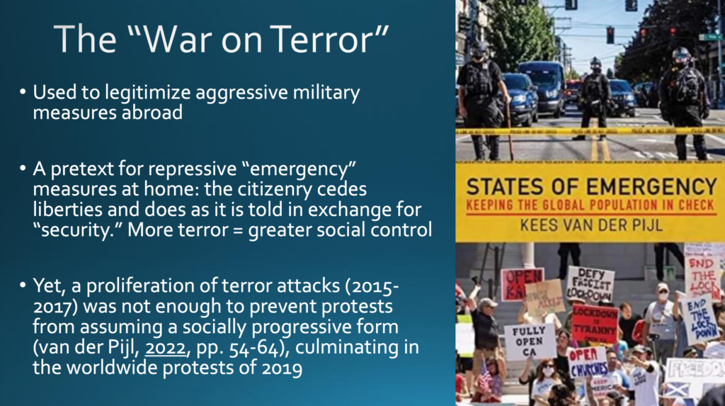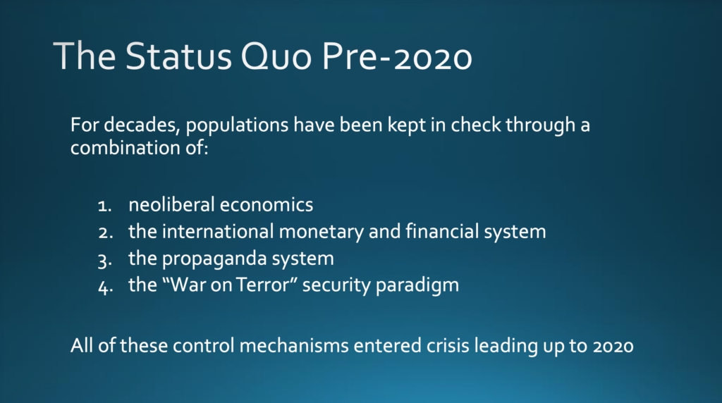Ich möchte damit beginnen, die Entwicklungen seit 2020 in ihre komplexen Zusammenhänge einzubetten. Das bedeutet, dass ich den Status quo vor 2020 einbeziehe — in meinem Buch »›Covid-19‹, Psychological Operations, and the War for Technocracy« gehe ich näher darauf ein. Vereinfacht ausgedrückt, wurden die Bevölkerungen über Jahrzehnte mittels einer Kombination aus vier Faktoren in Schach gehalten, nämlich dem neoliberalen Wirtschaftssystem, dem internationalen Währungs- und Finanzsystem, dem Propagandasystem sowie dem Sicherheitsparadigma des sogenannten »Krieges gegen den Terror«. Alle diese Kontrollmechanismen sind in den Jahren vor 2020 in eine Krise geraten.