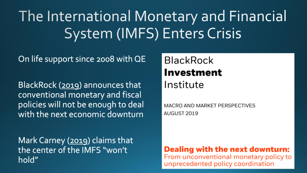 Der zweite Faktor ist das internationale Finanz- und Währungssystem, welches seit 2008 in vielerlei Hinsicht durch Quantitative Lockerung am Leben erhalten wurde. Aber im August 2019 veröffentlichte BlackRock ein ungewöhnliches Dokument mit dem Titel »Dealing with the next downturn«, übersetzt etwa »Umgang mit dem nächsten Abschwung«.6 Darin heißt es, dass herkömmliche geld- und steuerpolitische Maßnahmen nicht ausreichen werden, um den nächsten Wirtschaftsabschwung zu bewältigen. Offensichtlich stand eine grundlegende Veränderung bevor. Mark Carney, seinerzeit Gouverneur der Bank of England, bekannte im August 2019 in Jackson Hole, Wyoming, vor einer Gruppe sehr einflussreicher Persönlichkeiten des internationalen Finanzwesens, dass das Zentrum des internationalen Währungs- und Finanzsystems »nicht halten wird«.