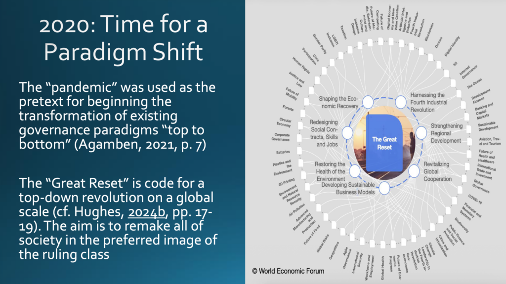 Wir sehen also, dass das bestehende Kontrollsystem auf allen Ebenen in eine Krise geriet. Deshalb war es im Jahr 2020 an der Zeit für einen Paradigmenwechsel, wie der italienische Philosoph Giorgio Agamben in seiner Schrift »An welchem Punkt stehen wir? Die Epidemie als Politik« erkannte. Die sogenannte »Pandemie — ob sie tatsächlich oder nur scheinbar eine solche ist«, so Agamben, diente »als Vorwand«, um »ein völlig neues Paradigma zu schaffen, wie Menschen und Dinge zu regieren seien«. Heute ist der »Great Reset« des Weltwirtschaftsforums der Code für eine Revolution von oben nach unten auf globaler Ebene mit dem Ziel, die gesamte Gesellschaft nach den Vorstellungen der herrschenden Klasse umzuformen. Das interaktive Diagramm des Great Reset auf der Internetseite des Weltwirtschaftsforums zeigt, wie jeder Bereich des Lebens berührt wird. Der Great Reset ist eine alles umfassende Umgestaltung der menschlichen Existenz.