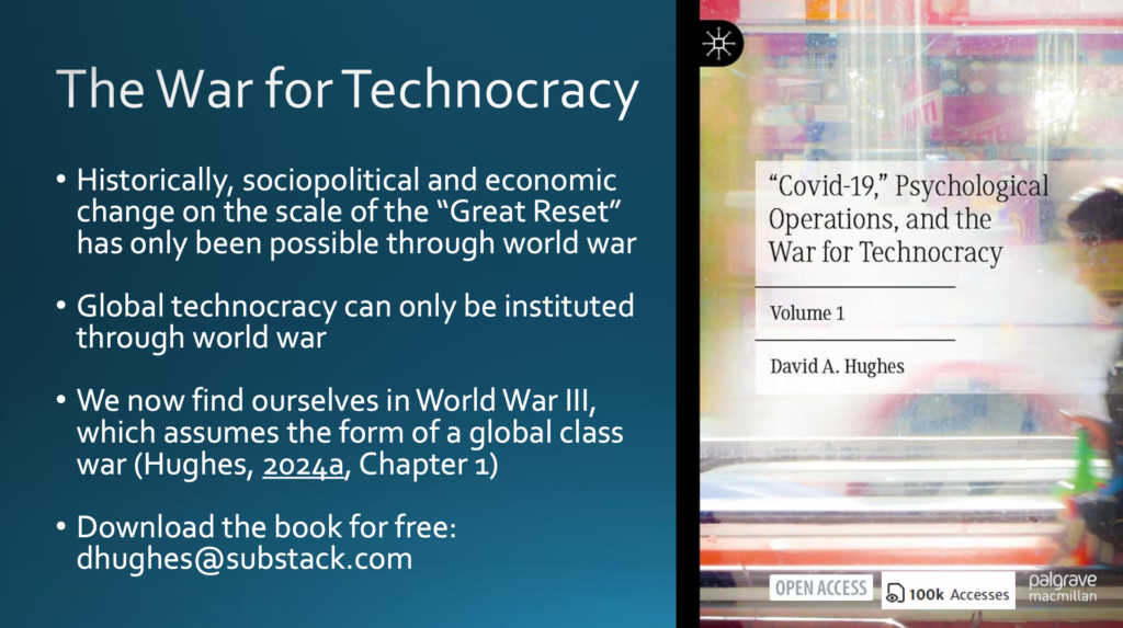Demnach kann die globale Technokratie nur durch einen Weltkrieg eingeführt werden. Daher argumentiere ich in meinem Buch, dass wir uns [bereits] im Dritten Weltkrieg befinden und zwar seit Ausrufen der Pandemie durch die Weltgesundheitsorganisation Anfang 2020 sowie, dass dieser Krieg die Form eines globalen Klassenkampfes annimmt. Sie können das Buch kostenlos von meinem Substack dhughes.substack.com herunterladen.