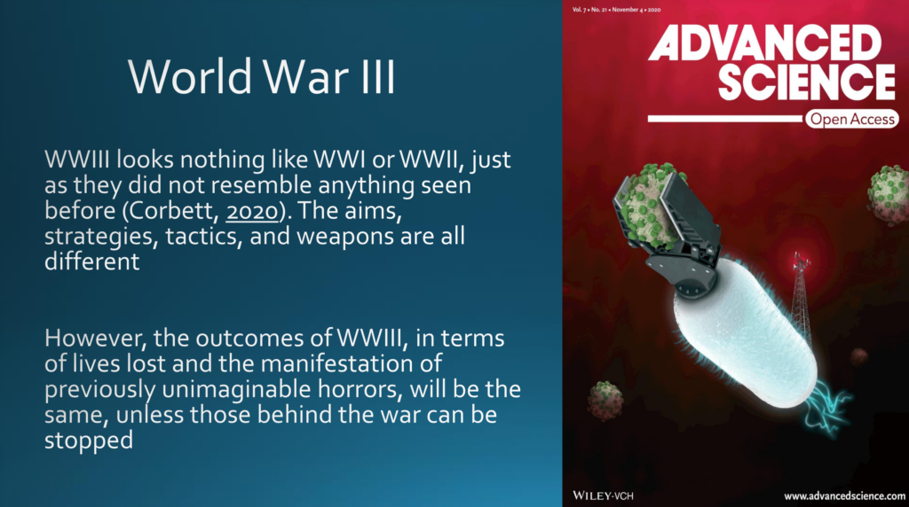 Der Dritte Weltkrieg ähnelt weder dem Ersten noch dem Zweiten Weltkrieg, ebenso wenig wie diese beiden Kriege etwas zuvor Dagewesenem ähnelten — die Ziele, Strategien, Taktiken und Waffen sind vollkommen anders. Technologie revolutioniert üblicherweise den Krieg. Betrachten wir die heutigen Technologien, etwa auf dieser Titelseite von Advanced Science im November 2020, kurz vor der Markteinführung der Impfstoffe: ein Nanoroboter bewegt sich durch den Blutkreislauf und wird über ein elektromagnetisches Feld gesteuert, im Hintergrund der Sendemast. Es steht fest, dass der Dritte Weltkrieg hinsichtlich verlorener Menschenleben und dem Sichtbarwerden bisher unvorstellbarer Gräuel die gleichen Auswirkungen haben wird — es sei denn, die Hintermänner des Krieges können aufgehalten werden.
