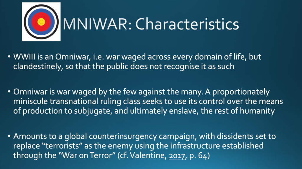 James Corbett bietet eine treffende Beschreibung des Omniwar: »ein allumfassender Krieg, der bereits jetzt gegen uns alle geführt wird, ein Kampf um die umfassende Herrschaft über jeden einzelnen Gesichtspunkt unseres Lebens: unsere Bewegungen, wechselseitigen Einflüsse und Beziehungen, sogar unsere innersten Gedanken, Gefühle und Wünsche. Regierungen auf der ganzen Welt arbeiten mit Unternehmen zusammen, um die Technologie dafür einzusetzen, Sie bis auf die Ebene des Genoms hinab zu kontrollieren, und sie werden nicht aufhören, bis jede einzelne Person, die sich ihnen widersetzt, unterworfen oder ausgeschaltet ist.«