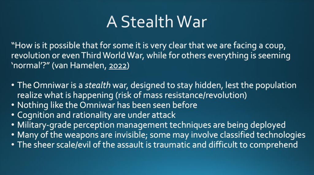 Etwas wie diesen alles umfassenden, alles durchwirkenden Krieg hat es noch nie gegeben — es gibt keinen historischen Präzedenzfall, mit dem wir diese Art von Krieg vergleichen können. Wie ich im Folgenden zeigen werde, gehören beim Omniwar selbst Wahrnehmung und Vernunft zu den Angriffszielen. Dadurch wird es für die Bevölkerung schwierig, klar zu erkennen was geschieht. Das Problem wird durch Methoden zur Wahrnehmungssteuerung auf militärischem Niveau hervorgerufen, die gegen die Bevölkerung eingesetzt werden. Viele der Waffen im Omniwar sind unsichtbar und bei einigen könnte es sich sogar um Technologien handeln, die der Geheimhaltung unterliegen. Schließlich sind das schiere Ausmaß und die schiere Bösartigkeit dieses Angriffs schockierend; sie sind traumatisch, schwer zu begreifen und hinzunehmen.
