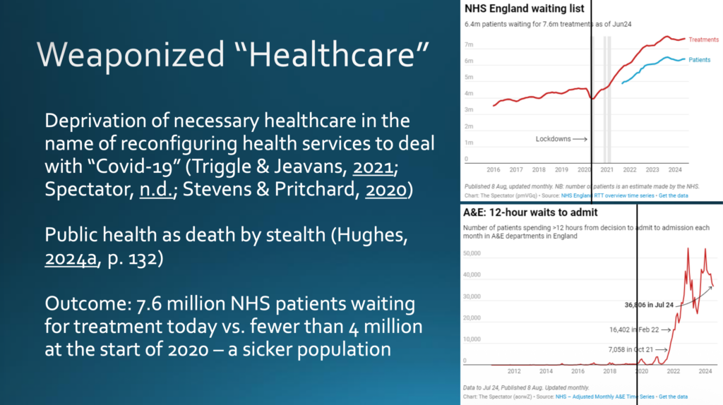 Die Gesundheitsversorgung ist seit 2020 zu einer Waffe geworden. Zumindest hat der Entzug der notwendigen Gesundheitsversorgung, anlässlich der Umgestaltung der Dienste des Gesundheitswesens zur Bewältigung von Covid-19, zu dem geführt, was ich als »public health as death by stealth« bezeichnet habe, übersetzt etwa »öffentliches Gesundheitswesen: der Tod lauert im Verborgenen«. Die Daten des britischen National Health Service (NHS) weisen aus, dass sich die vom NHS erhobene Warteliste für Behandlungen seit 2020 etwa verdoppelt hat. In der Notaufnahme zwölf Stunden zu warten, war vor 2020 nahezu gänzlich unbekannt, ist heute aber die Regel — ein Rezept für eine kränkere Bevölkerung.