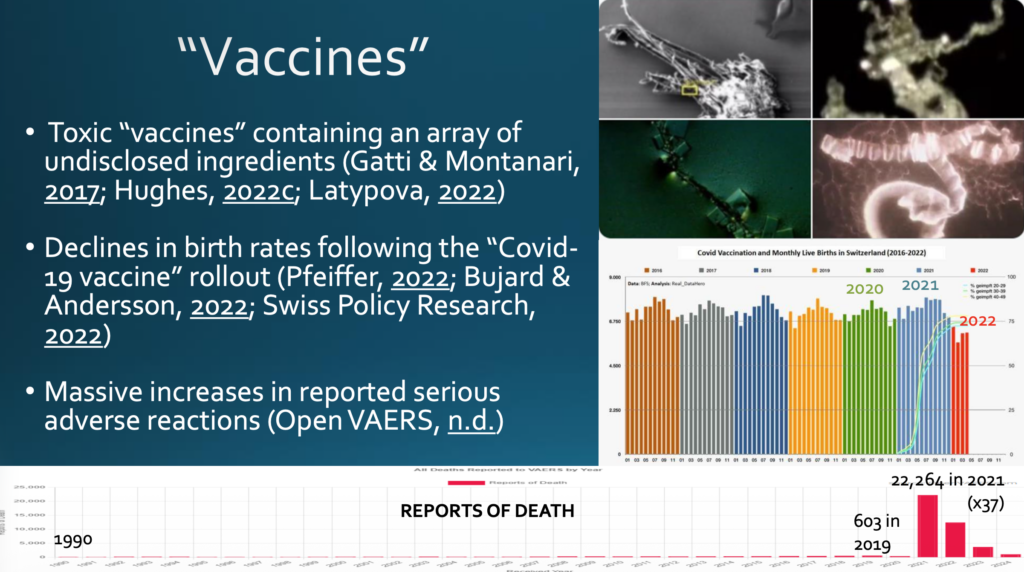 Bereits vor 2020 war bekannt, dass Impfstoffe eine Reihe von Schwermetallen enthalten, aber wirklich beunruhigend sind die Bilder der Artefakte, die Mikroskopiker bei den Covid-19-Impfstoffen gefunden haben. Es ist unklar, was es mit den Objekten, oben rechts auf dem Bild auf sich hat, aber es leuchtet ein, dass sie nicht dort hingehören. Seit der Markteinführung der sogenannten »Covid-19-Impfstoffe« sind die Geburtenraten zurückgegangen. In der Mitte der Graphik, rechts unten, steht jede Farbe für ein Jahr, also 2020 in Grün, 2021 in Blau (das Jahr der Markteinführung), dann in Rot ein signifikanter Rückgang der Geburtenraten (die Zahlen kommen aus der Schweiz, aber das Phänomen tritt transnational auf). Es gibt einen enormen Anstieg der gemeldeten schwerwiegenden unerwünschten Nebenwirkungen nach der Markteinführung. In der Graphik unten sehen wir OpenVAERS-Daten zu den Meldungen von Todesfällen über drei Jahrzehnte. Die höchste Anzahl der Meldungen liegt bei 603 im Jahr 2019. Zwei Jahre später schnellt sie auf 22.264 Meldungen hoch (das 37-Fache).