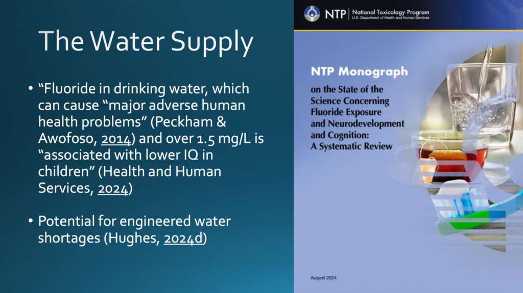 Dann die Wasserversorgung: Fluoride im Trinkwasser können beim Menschen erhebliche gesundheitliche Beeinträchtigungen verursachen. Infolge einer Studie aus dem Jahr 2014 erkannte selbst das Gesundheitsministerium der Vereinigten Staaten im August 2024 an, dass mehr als 1.5 Milligramm Fluorid pro Liter Trinkwasser mit einem niedrigeren Intelligenzquotienten bei Kindern in Verbindung gebracht werden. Wasser könnte auch eingesetzt werden, um künstliche Knappheit zu erzeugen (ich bin in einem aktuellen Substack-Artikel darauf eingegangen).