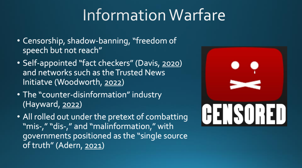 Der Informationskrieg hat seit 2020 seine hässliche Fratze gezeigt. Wir haben viel Zensur erlebt: Shadow Banning, den Leitsatz von Linda Yaccarino: »freedom of speech but not reach«, übersetzt etwa »Redefreiheit, allerdings ohne Reichweite«, selbsternannte Netzwerke zur Überprüfung von Fakten, etwa die Trusted News Initiative sowie die »Anti-Desinformationsindustrie«. Alles dies wurde unter dem Vorwand des Kampfes gegen sogenannte »Fehl-, Falsch- und Desinformation« veranlasst, wobei sich Regierungen, wie die ehemalige neuseeländische Premierministerin Jacinda Ardern es nannte, als »einzige Quelle der Wahrheit« positionierten, im Original: »single source of truth«.