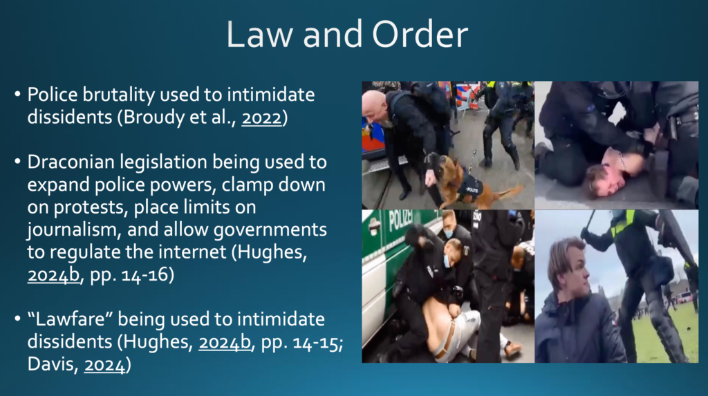 Auch Recht und Ordnung werden anscheinend als Waffen eingesetzt. Denken Sie beispielsweise an die transnationale Polizeigewalt, mit der Dissidenten während Covid eingeschüchtert wurden. In meinem Buch »Wall Street, the Nazis, and the Crimes of the Deep State« habe ich die drakonischen Gesetze erörtert, die gegenwärtig im Vereinigten Königreich eingesetzt werden, um die Polizeibefugnisse zu erweitern, Proteste zu unterbinden, den Journalismus einzuschränken und Regierungen zu erlauben, das Internet zu regulieren. Auch der juristische Krieg (lawfare) wird zur Einschüchterung von Dissidenten eingesetzt. Der Fall Richard D. Hall, über den nächsten Monat das Urteil erwartet wird, ist das beste Beispiel dafür im Vereinigten Königreich.