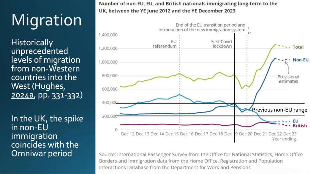 Auch die Migration hat seit Beginn des Omniwars einige außergewöhnliche Muster gezeigt. Wir erleben ein historisch beispielloses Ausmaß an Migration aus nicht-westlichen Ländern in den Westen. Die Graphik veranschaulicht Daten des britischen Office for National Statistics für das Vereinigte Königreich selbst: Die senkrechte schwarze Gerade repräsentiert das Ende des EU-Übergangszeitraums. Es fällt auf, dass die Zuwanderung aus Nicht-EU-Ländern (dunkelblaue Kurve), die sich bis zu diesem Zeitpunkt in vergleichsweise schmalen Grenzen bewegte, plötzlich weit über diesen Rahmen hinausschnellt, was natürlich eine destabilisierende Wirkung auf die Gesellschaft erwarten lässt. Wir wissen nicht genau, wer all diese Menschen sind, die zu uns kommen. Das Phänomen tritt nicht nur im Vereinigten Königreich auf, sondern transnational.