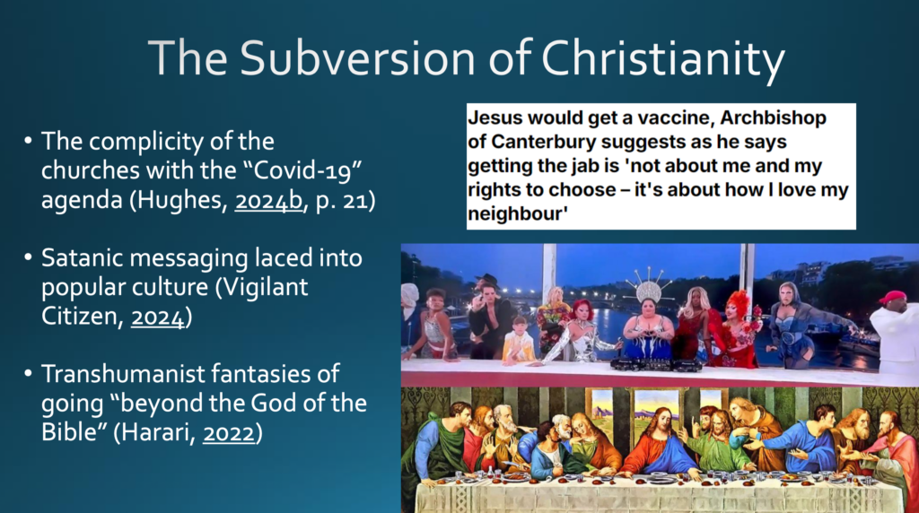 Die Religion wird angegriffen, vor allem das Christentum im Westen, zu erkennen etwa an der Komplizenschaft der Kirchen mit der sogenannten »Covid-19«-Agenda, als der Erzbischof von Canterbury sagte, dass Jesus geimpft werden würde oder als die Kirche ihre Pforten für Kranke und Aussätzige verriegelte, ihre Einrichtungen aber im Jahr darauf in Impfzentren umwandelte. Satanische Botschaften sind bereits seit geraumer Zeit in der Populärkultur verankert — das lässt sich auf der Internetseite des Blogs Vigilant Citizen (vigilantcitizen.com) gut nachverfolgen. Die Eröffnungsfeier der Olympischen Spiele in Paris, mit der Verhöhnung des Abendmahls Jesu (rechts unten zu sehen), ist ein bemerkenswertes Beispiel aus der Gegenwart. Überdies transhumanistische Fantasien, die laut Yuval Noah Harari »über den Gott der Bibel hinausgehen«.