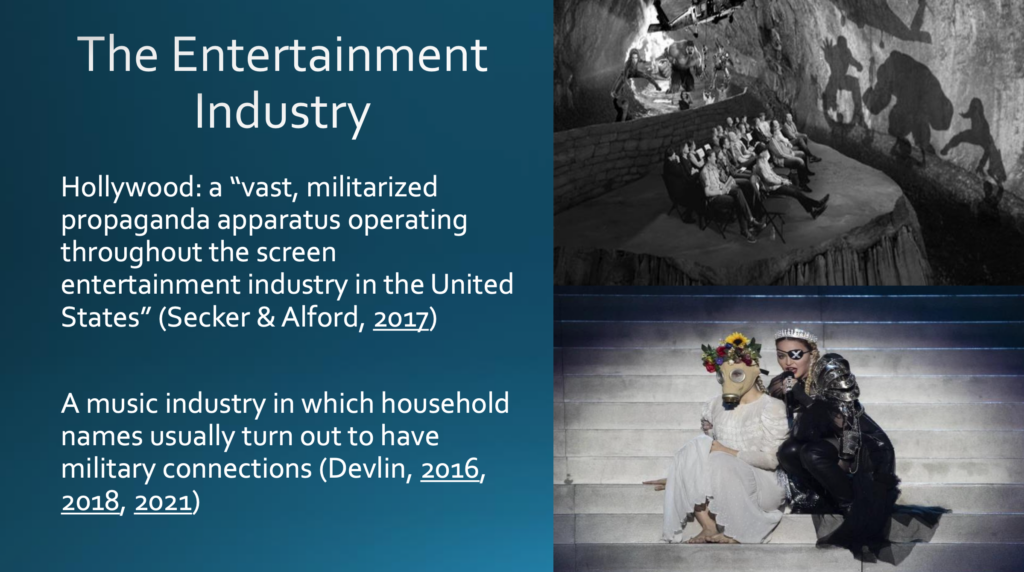 Nicht zuletzt die Unterhaltungsindustrie: Hollywood repräsentiert, was Secker und Alford einen »riesigen militarisierten Propagandaapparat« nennen, »der in der gesamten Unterhaltungsindustrie der Vereinigten Staaten operiert«. Ähnliches gilt für die Musikindustrie: Mark Devlin deckt in seiner Trilogie »Musical Truth« auf, dass die meisten bekannten Personen militärische Verbindungen haben.