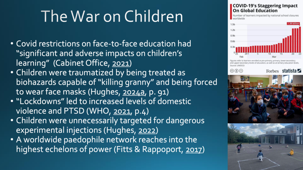 Am widerwärtigsten ist vielleicht, dass wir Zeugen eines Krieges gegen Kinder werden. Das britische Cabinet Office erkennt an, dass die Einschränkungen des [gewohnten] Unterrichts von Angesicht zu Angesicht »erhebliche und negative Auswirkungen auf das Lernen der Kinder« hatten. Kinder wurden traumatisiert, indem sie als biologische Gefahr behandelt wurden, die ihre »Oma umbringen« könnte. Kinder wurden zum Maskentragen gezwungen. Die Abriegelungen (lockdowns) führten zu einem Anstieg von häuslicher Gewalt und posttraumatischen Belastungsstörungen.Kinder wurden unnötigerweise mit gefährlichen experimentellen Injektionen behandelt, wie ich bereits dargelegt habe. Darüber hinaus gibt es zunehmend Beweise dafür, dass ein weltweites pädophiles Netzwerk bis in die höchsten Ebenen der Macht reicht.