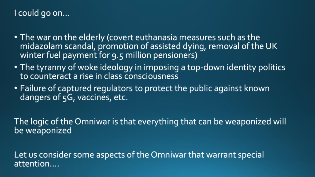 Ich könnte noch mehr sagen. Es gibt so viel mehr zu sagen: Ich könnte über den Krieg gegen ältere Menschen sprechen, ich könnte über die Tyrannei der »Woke«-Ideologie sprechen, ich könnte über das Versagen der gekaperten Regulierungsbehörden sprechen, die dem Schutz der Öffentlichkeit verpflichtet gewesen wären. Die Logik des Omniwar ist, dass alles, was als Waffe eingesetzt werden kann, auch als Waffe eingesetzt werden wird. Im weiteren Verlauf dieses Vortrags möchte ich mich auf einige wenige Aspekte des Omniwar konzentrieren, die meiner Meinung nach besondere Aufmerksamkeit verdienen.
