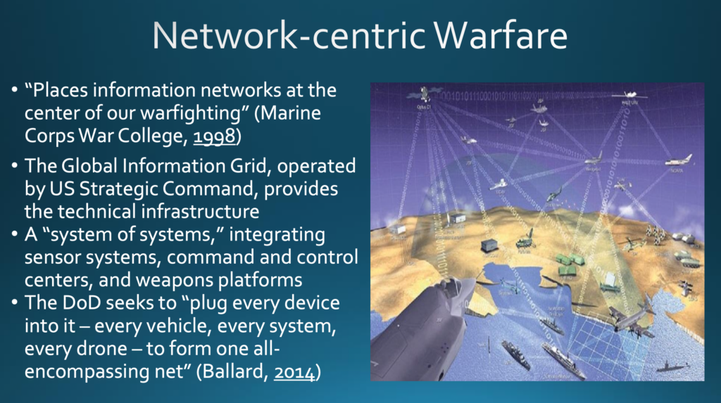 Ich beginne mit dem Konzept der netzwerkzentrierten Kriegsführung (network-centric warfare). Die Idee geht auf die späten 1990er Jahre und einen Bericht des Marine Corps War College mit der Überschrift »Network Centric Warfare: An Emerging Warfighting Capability« zurück. Die netzwerkzentrierte Kriegsführung »stellt die Informationsnetze in den Mittelpunkt unserer Kriegsführung«.75 Einige Jahre später wurde das vom U.S. Strategic Command, übersetzt etwa: »Strategisches Kommando der Vereinigten Staaten«, betriebene Global Information Grid (GIG) entwickelt, das im Wesentlichen die technische Infrastruktur für die netzwerkzentrierte Kriegsführung bereit stellt, ein »System von Systemen«, das Sensorsysteme, Kommando- und Kontrollzentren und Waffenplattformen integriert. Einer Studie aus dem Jahr 2014 zufolge, versucht das Verteidigungsministerium der Vereinigten Staaten, »jedes Gerät — jedes Fahrzeug, jedes System, jede Drohne — zu einem allumfassenden Netz zusammenzufassen«.