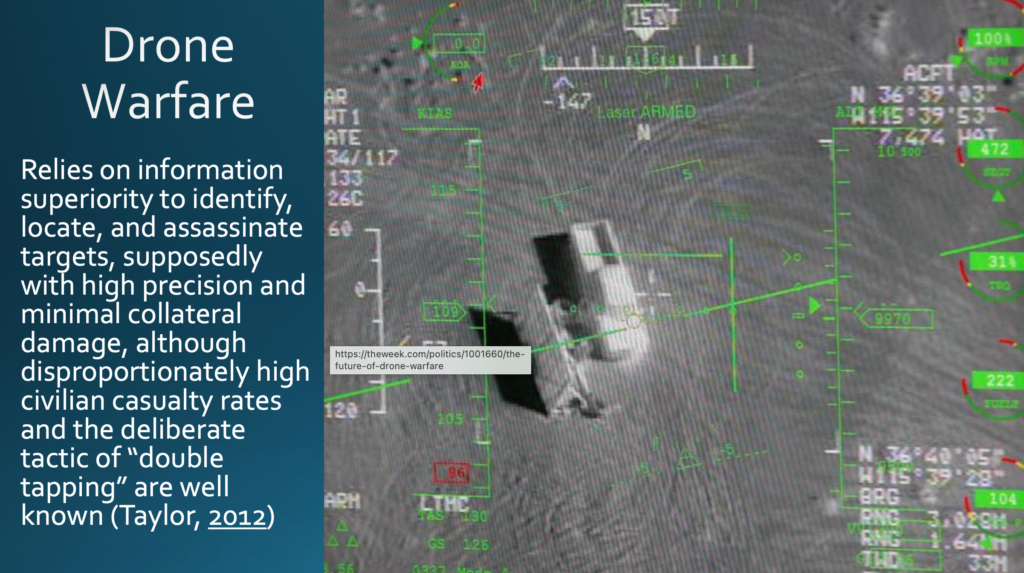 Der Drohnenkrieg ist ein klassisches Beispiel. Er stützt sich auf Informationsüberlegenheit, um »Ziele« zu erkennen, zu entdecken und zu ermorden, angeblich mit hoher Präzision und minimalen Kollateralschäden, obwohl die Zahl der zivilen Opfer bekanntlich unverhältnismäßig hoch ist — und wir wissen auch um den vorsätzlichen »Doppelschlag« (double tapping).