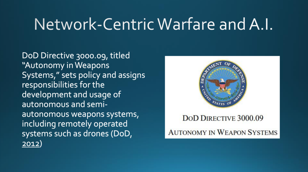 In den letzten Jahren wurde die netzwerkzentrierte Kriegsführung mit der KI verbunden. Diese Verknüpfung reicht bis in das Jahr 2012 zurück, als die KI einen maßgeblichen Fortschritt verzeichnete, der unmittelbar in Direktive 3000.09 »Autonomy in Weapons Systems«, übersetzt etwa »Selbständigkeit bei Waffensystemen«, des Verteidigungsministeriums der Vereinigten Staaten als Waffe eingesetzt wurde.