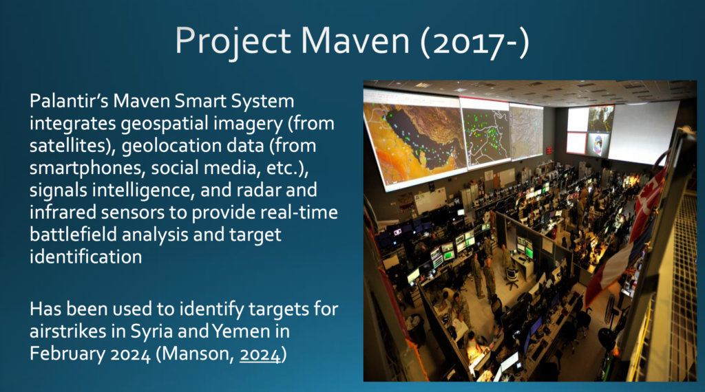 Wir sehen die Verknüpfung beim »Project Maven« in Aktion (seit 2017 in Entwicklung). Das »Maven Smart System« wird von Palantir betrieben und integriert von Satelliten erhaltene räumliche geographische Bildinformationen, geographische Lokalisierungsinformationen von Smartphones, sozialen Medien et cetera, Radar- und Infrarotsensoren zur Signalaufklärung für die Echtzeitanalyse von Gefechtsfeldern sowie zur Identifizierung von Zielen. Das Maven Smart System wurde bereits in der Praxis eingesetzt, etwa 2024, um Ziele für Luftangriffe in Syrien und im Jemen zu identifizieren.