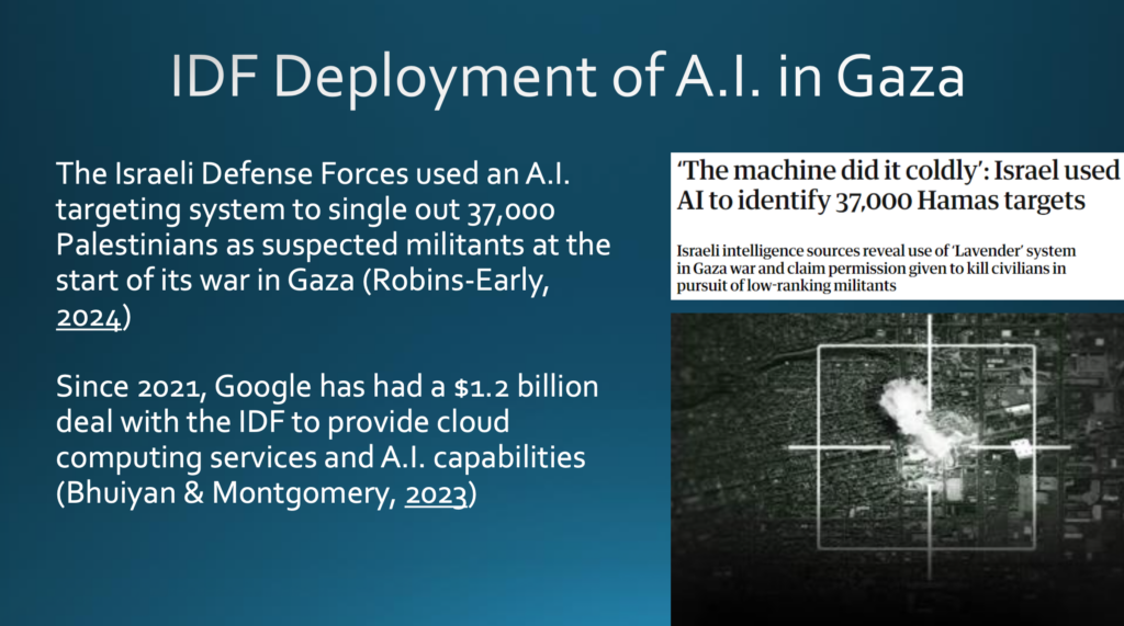 Die Streitkräfte Israels haben KI beispielsweise im Gazastreifen eingesetzt, um 37.000 Palästinenser ausfindig zu machen, die zu Beginn des Gazakrieges als militant galten. Auch Google ist beteiligt: Das Unternehmen hat mit den Streitkräften Israels einen Vertrag über 1.2 Milliarden Dollar abgeschlossen, um Cloud-Computing-Dienste und Funktionen aus dem Spektrum der KI zur Verfügung zu stellen.