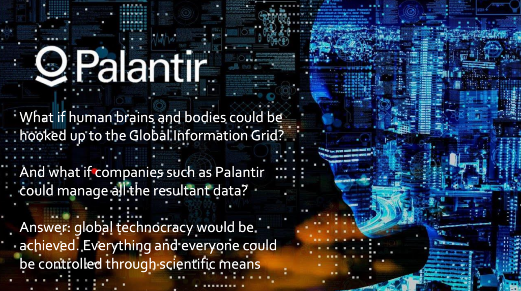 Angenommen, Menschen und ihre Körper würden zu Knoten eines biodigitalen Kontrollnetzes, menschliche Gehirne und Körper könnten an das Global Information Grid angeschlossen werden und Unternehmen wie Palantir könnten alle daraus resultierenden Informationen verwalten. Dann wäre eine globale Technokratie entstanden: alles und jeder könnte überwacht und gesteuert werden.