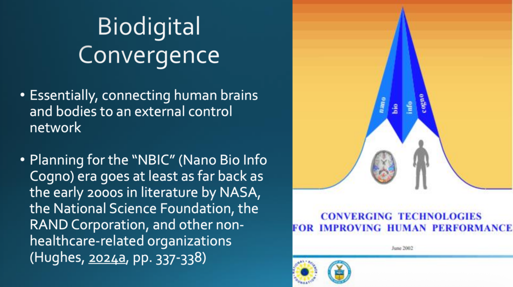 Damit kommen wir zum Konzept der biodigitalen Konvergenz, im Wesentlichen die Verbindung menschlicher Gehirne und Körper mit einem externen Kontrollnetz. Die biodigitale Konvergenz steht im Zusammenhang mit der Epoche der Verzahnung von Nano-, Bio- und Informationstechnologie, zusammen mit Kognitionswissenschaft, kurz »NBIC«, die auf die frühen 2000er Jahre zurückgeht und in Planungsdokumenten der NASA, der National Science Foundation, der RAND-Corporation und vieler anderer, nicht zum Gesundheitswesen gehöriger Einrichtungen beschrieben wird (hierzu mein Buch, [Anm. 1]).