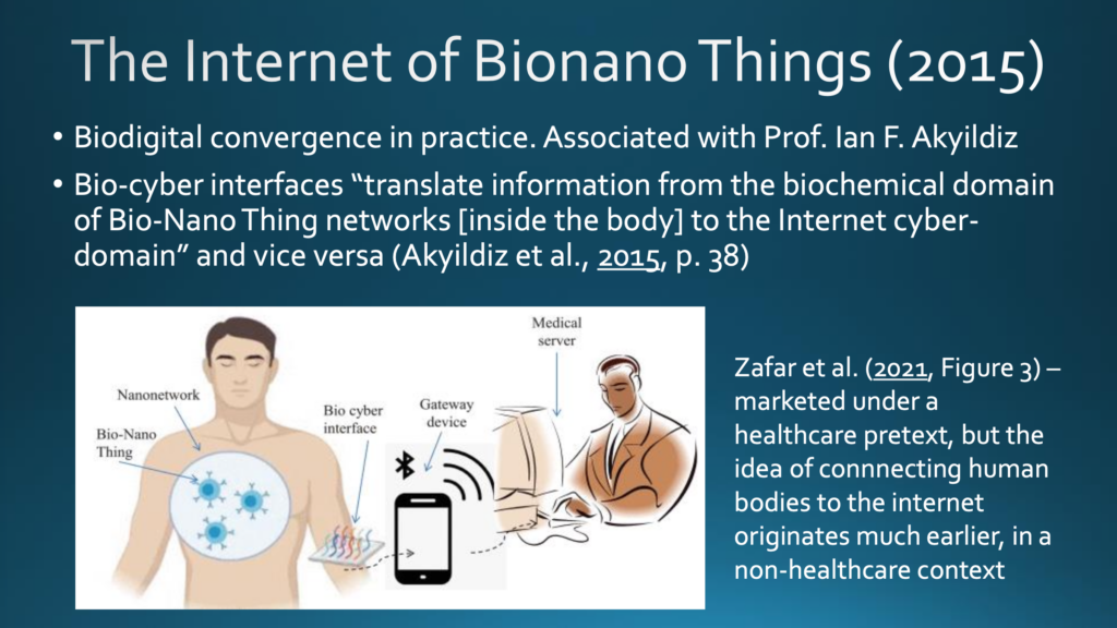 Damals handelte es sich nur um eine Vision, aber inzwischen wird sie immer mehr zur Realität, vor allem durch das sogenannte »Internet of Bionano Things«, das in einer wegweisenden Publikation aus dem Jahr 2015 von Professor Ian F. Akyildiz, dem Hauptautor, beschrieben wurde. Für mich sieht das sehr nach biodigitaler Konvergenz in der Praxis aus. In Akyildiz’ Publikation wurden »bio-cyber interfaces« erörtert, übersetzt etwa »Schnittstellen zwischen biologischer Substanz und dem Internet«, die »Informationen aus der biochemischen Domäne des Internet of Bionano Things« (innerhalb des Körpers) »in die Internetdomäne [außerhalb des Körpers] und umgekehrt übersetzen« würden. Das klingt vielleicht ein wenig übertrieben, aber wenn Sie sich diese Abbildung anschauen, verstehen Sie die Idee. Im Wesentlichen geht es um die Schaffung intrakorporaler (körperinnerer) Nanonetzwerke, die mit dem Internet kommunizieren können. Dies wird in der Regel unter dem Vorwand medizinischer Versorgung vermarktet, aber die Literatur zur biodigitalen Konvergenz reicht weit darüber hinaus.