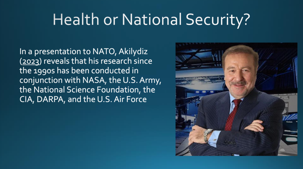 Geht es hier also wirklich um die Gesundheit oder um die nationale Sicherheit? Akyildiz hielt 2023 einen Vortrag vor der NATO, in dem er preisgab, dass seine Forschung seit den 1990er Jahren in Zusammenarbeit mit der NASA, den Streitkräften der Vereinigten Staaten, der National Science Foundation (NSF), der Central Intelligence Agency (CIA), der Defense Advanced Research Projects Agency (DARPA) und der Luftwaffe der Vereinigten Staaten durchgeführt worden war. Ich würde also sagen, dass es hier eher um die nationale Sicherheit geht als um die Gesundheit.