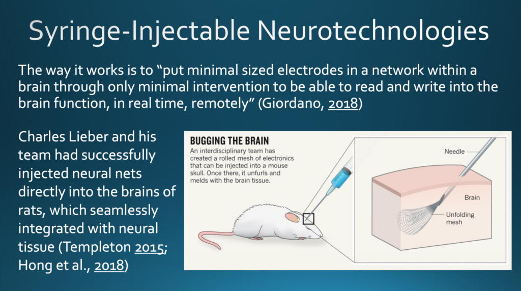 »Die Funktionsweise«, so Giordano, wiederum bei seinem Vortrag vor den Kadetten am Modern War Institute in West Point im September 2018, besteht darin, »dass man durch minimalinvasive Operatione Elektroden minimaler Größe ins neuronale Netz des Gehirns einbringt, um die Gehirnfunktionen in Echt- zeit von Außen lesen und schreiben zu können«. Inzwischen hatten Charles Lieber und sein Team von Wissenschaftlern erfolgreich neuronale Netze direkt in die Gehirne von Ratten injiziert, die sich nahtlos in das neuronale Gewebe integrierten. Es war also bereits bekannt, dass dies[er Zugang] möglich war.