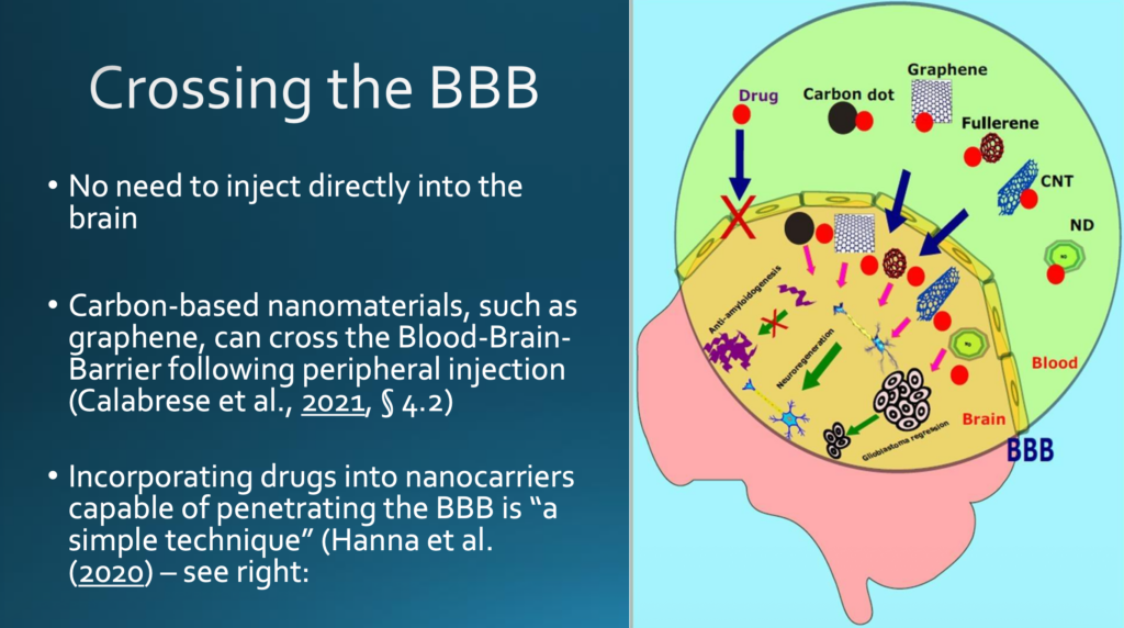 Doch ist es nicht erforderlich, direkt ins Gehirn zu injizieren, denn neue Nanowerkstoffe wie Graphen können nach einer peripheren Injektion die Blut-Hirn-Schranke überwinden. Eine Studie aus dem Jahr 2020 spricht sogar von »einer einfachen Methode«.