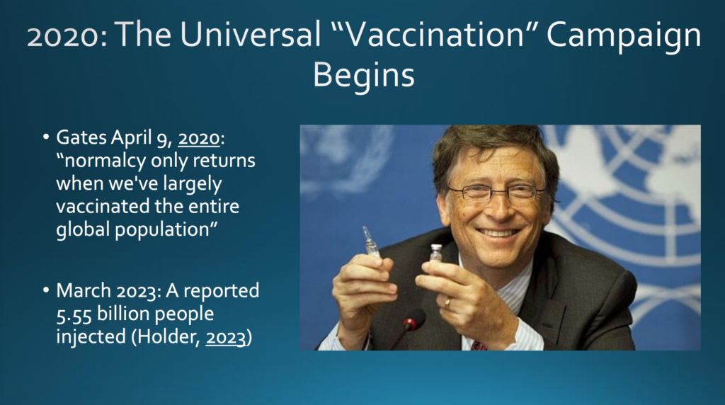 »Die Normalität kehrt erst zurück, wenn wir die gesamte Weltbevölkerung weitgehend geimpft haben«, so Gates. Wenn man Zeitungsberichten glauben darf (was im Allgemeinen nicht zutrifft), dann sollen bis März 2023 5.55 Milliarden Menschen geimpft worden sein. Lissa wird in ihrem Vortrag noch etwas mehr über den zeitlichen Ablauf sprechen.