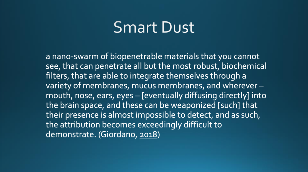 Injektionen sind nicht die einzige Möglichkeit, um diese Art von Technologie zu verabreichen. Smart Dust ist eine weitere. Giordano erklärt: [Smart Dust ist] »ein Schwarm von Nanopartikeln, bestehend aus bio-durchlässigen Werkstoffen, die man nicht sehen kann, die sämtliche, selbst die robustesten biochemischen Filter durchdringen können, die in der Lage sind, sich durch eine Vielzahl von Membranen hindurch zu integrieren, etwa durch Schleimhäute (Mund, Nase, Ohren, Augen) und schließlich unmittelbar ins Gehirn einzudringen. Diese [Schwärme von Nanopartikeln] können waffentauglich gemacht werden und es ist nahezu unmöglich, ihre Anwesenheit festzustellen. Dadurch wird es äußerst schwierig, ihre Zuordnung zum Körper nachzuweisen. «Partikel also, die so klein sind, dass sie in den menschlichen Körper eindringen können, die man nicht aufhalten kann, die ihren Weg ins Gehirn finden und waffentauglich gemacht werden können.
