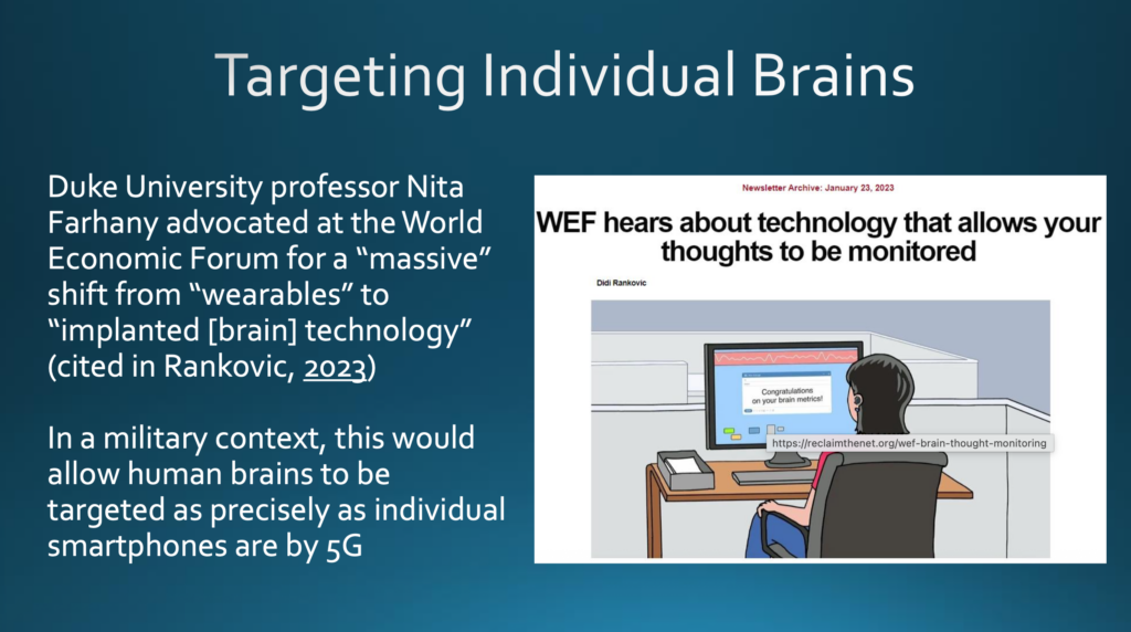 Als Nita Farahany, Professorin an der Duke University, auf dem Weltwirtschaftsforum für einen, wie sie es nannte, »massiven« Wechsel von »Wearables« zu »implantierter [Gehirn-]Technologie« plädierte, hatte sie offensichtlich keine Vorstellung davon, dass dies in einem militärischen Kontext gestatten würde, menschliche Gehirne mit 5G so genau anzusteuern, wie einzelne Smartphones.