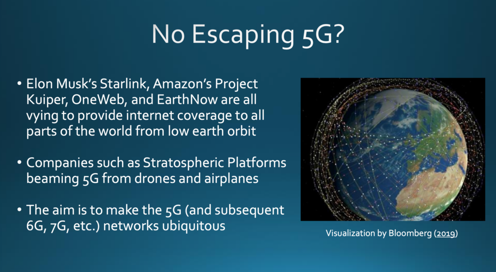 Noch beunruhigender: Wird es ein Entkommen aus diesen drahtlosen Kontrollnetzen geben, wenn wir an Elon Musks Projekt »Starlink«, Amazons »Projekt Kuiper«, »OneWeb« oder [das Tätigkeitsumfeld des Unternehmens] »EarthNow« [in Seattle] denken? Sie alle versuchen, alle Teile der Welt aus niedrigen Erdumlaufbahnen mit Internet zu versorgen. Es gibt auch Unternehmen wie »Stratospheric Platforms«, die 5G von Drohnen und Flugzeugen aus übertragen. Das Ziel scheint darin zu bestehen, 5G und später 6G, 7G et cetera allgegenwärtig zu machen.