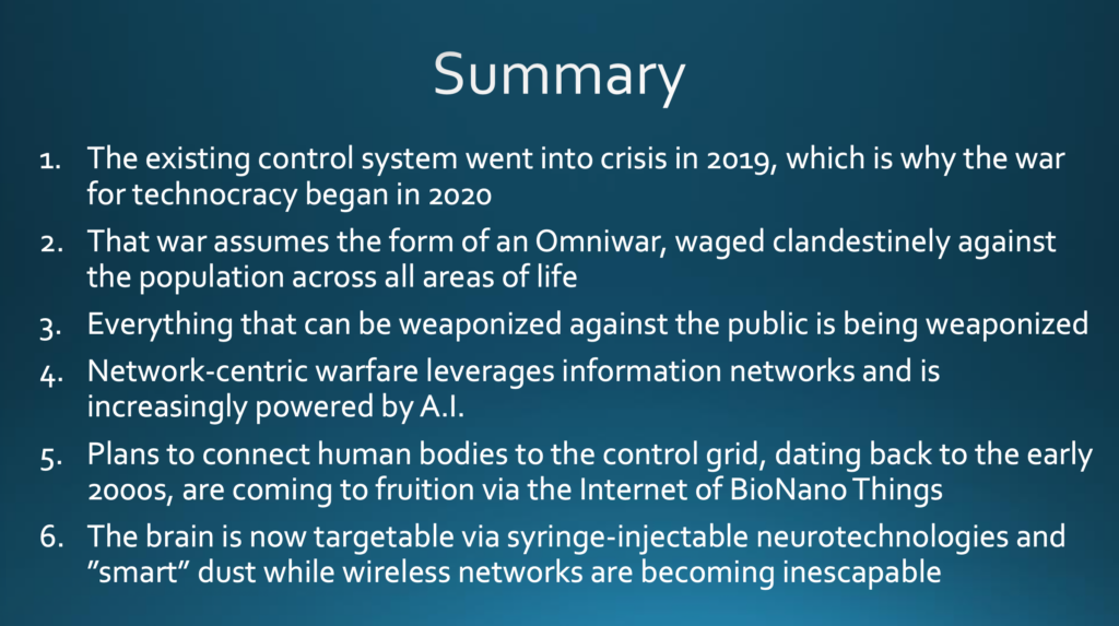 Welche Auswirkungen hat alles dies? Ob es uns gefällt oder nicht, wir alle sind nun Teilnehmer am Dritten Weltkrieg. Die Angreifer in diesem Krieg kämpfen für die globale Technokratie, für ein totalitäres Kontrollsystem, aufbauend auf biodigitalen Technologien. Das Ergebnis wird, sollten sie Erfolg haben, ein neuartiges und möglicherweise nicht umkehrbares System der Sklaverei sein, bei dem die Technokraten die totale Kontrolle über unser Leben haben werden. Pläne, den menschlichen Körper technisch so zu gestalten, dass er mit einem allgegenwärtigen drahtlosen Steuerungsnetz kompatibel ist, sind bereits seit Jahrzehnten in Umsetzung begriffen und wenn menschliche Gehirne und Körper zu Knoten eines biodigitalen Steuerungsnetzes werden, sind ferngesteuerte Folter und Ermordung ebenso wenig auszuschließen wie mittels KI automatisierte Entscheidungen, einschließlich der Entscheidung zu töten.